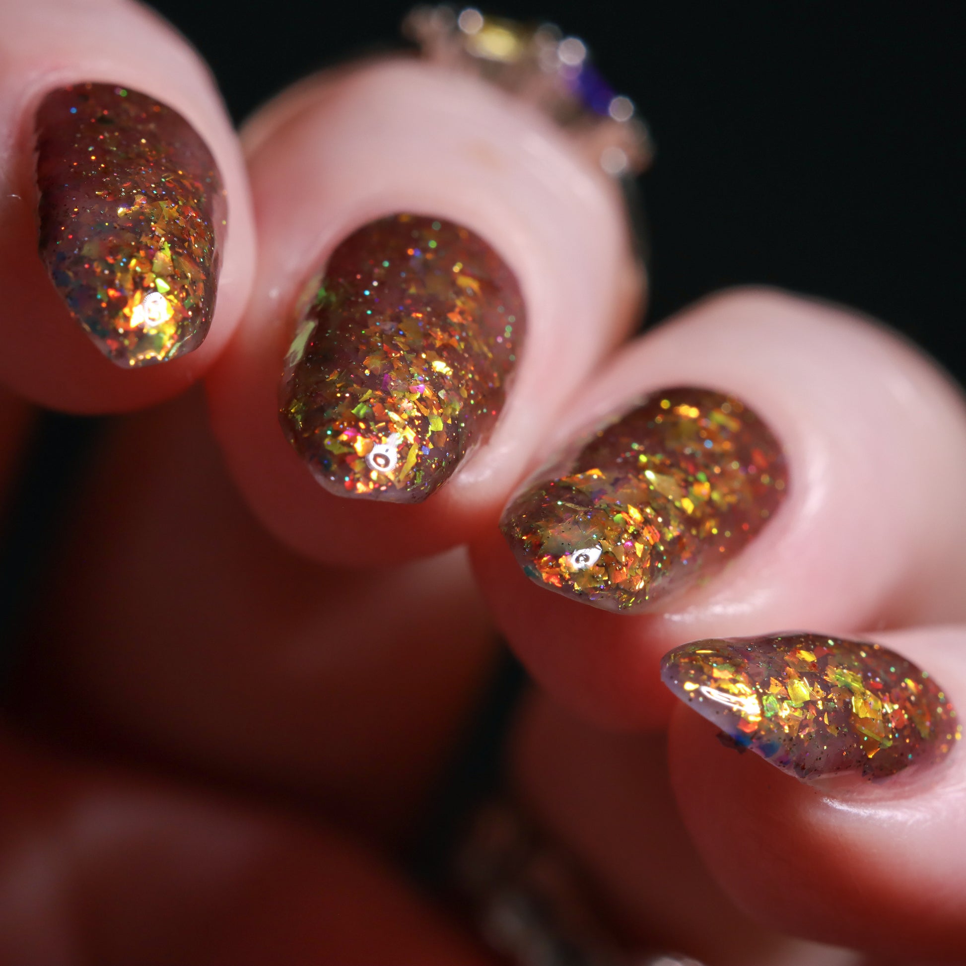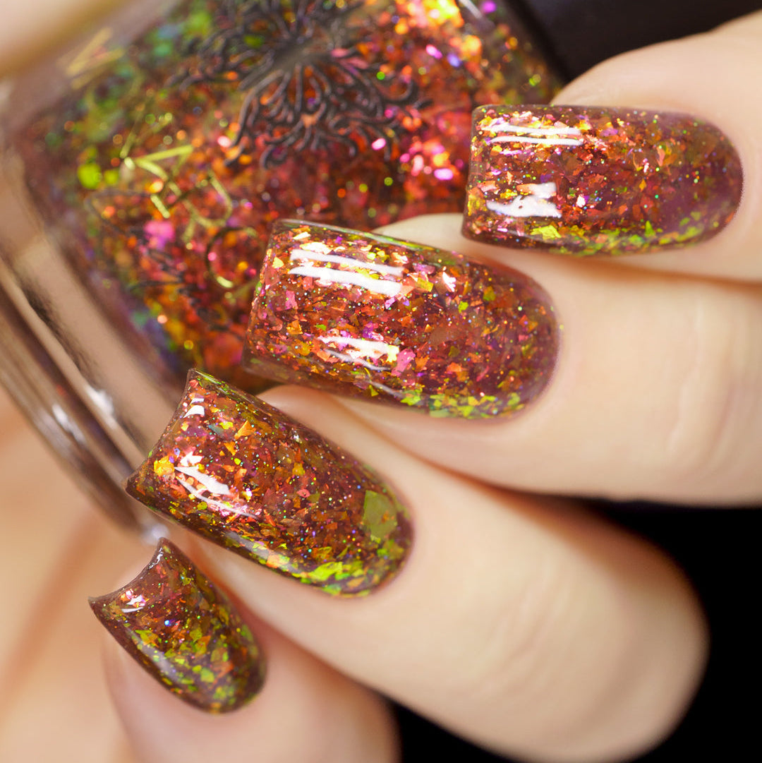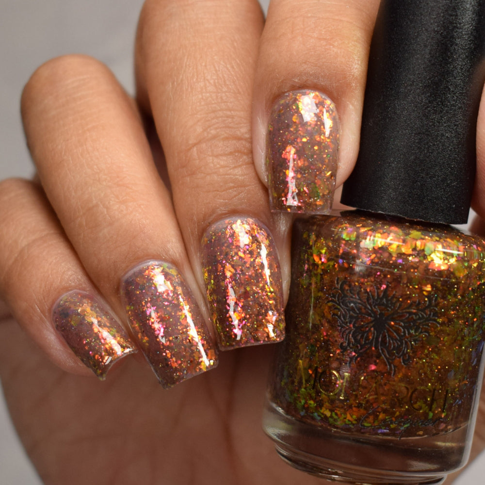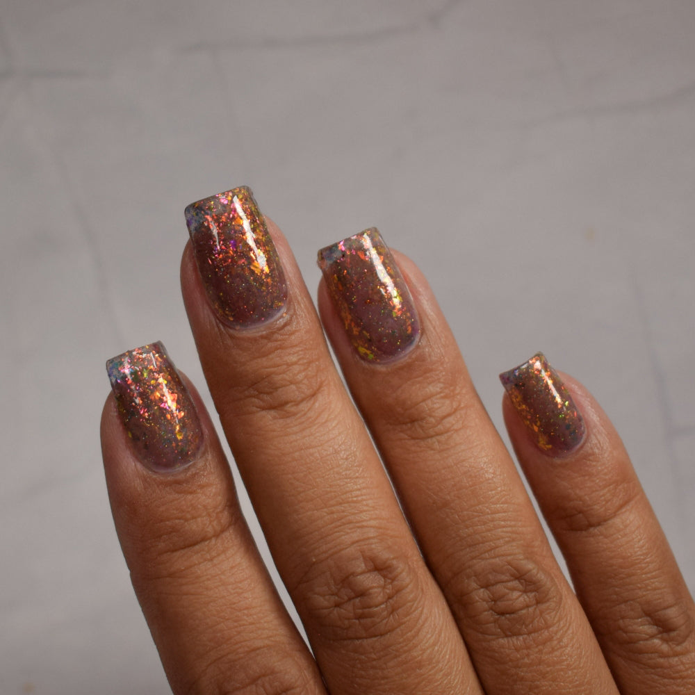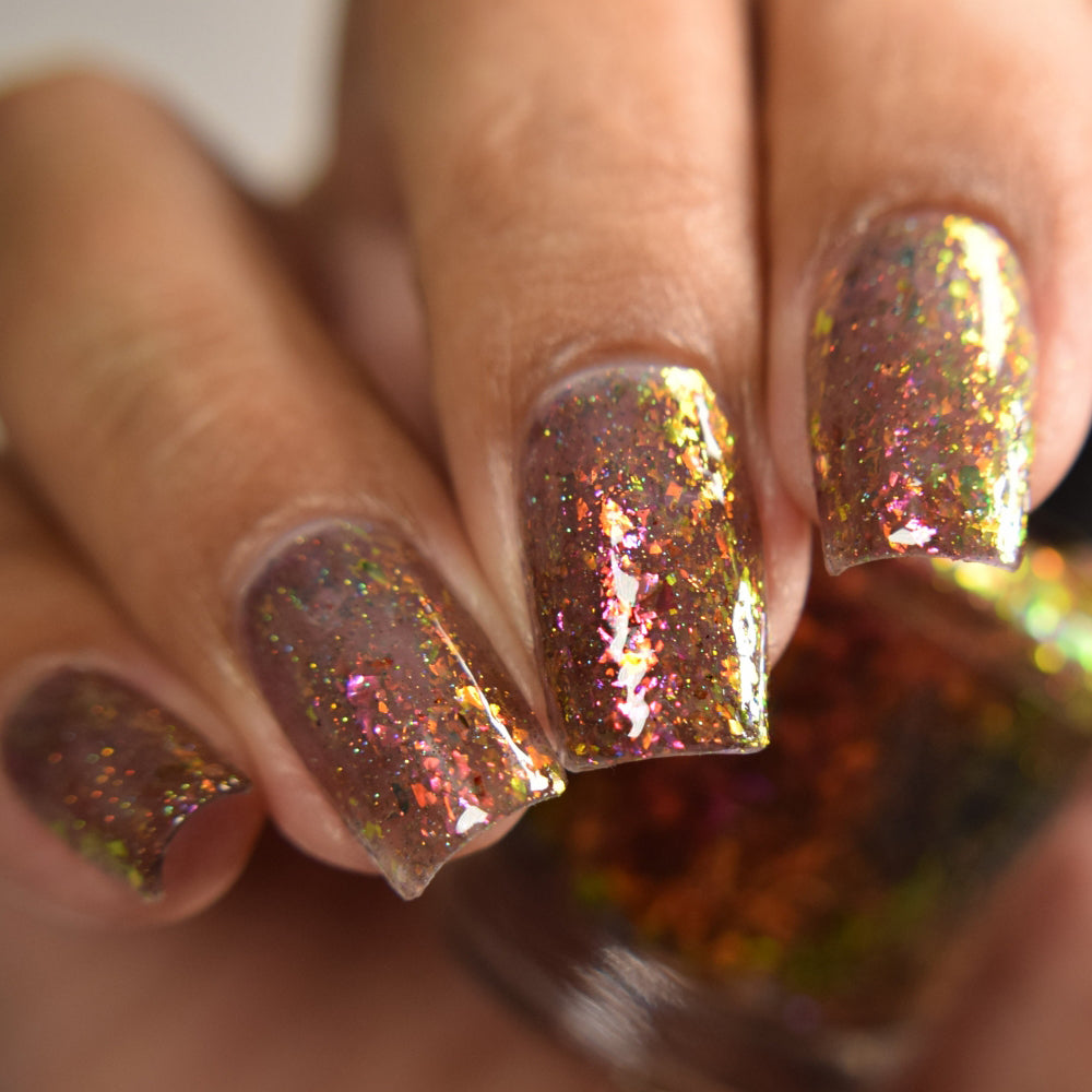 A taupe brown jelly base with red orange yellow green blue chameleon flake and hints of gold holo sparkle