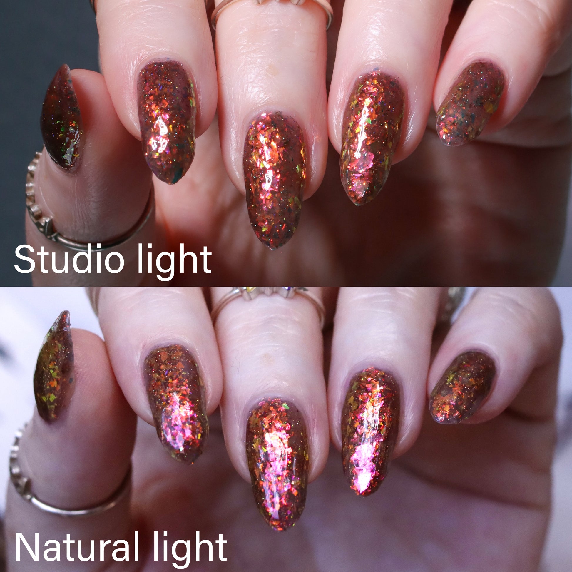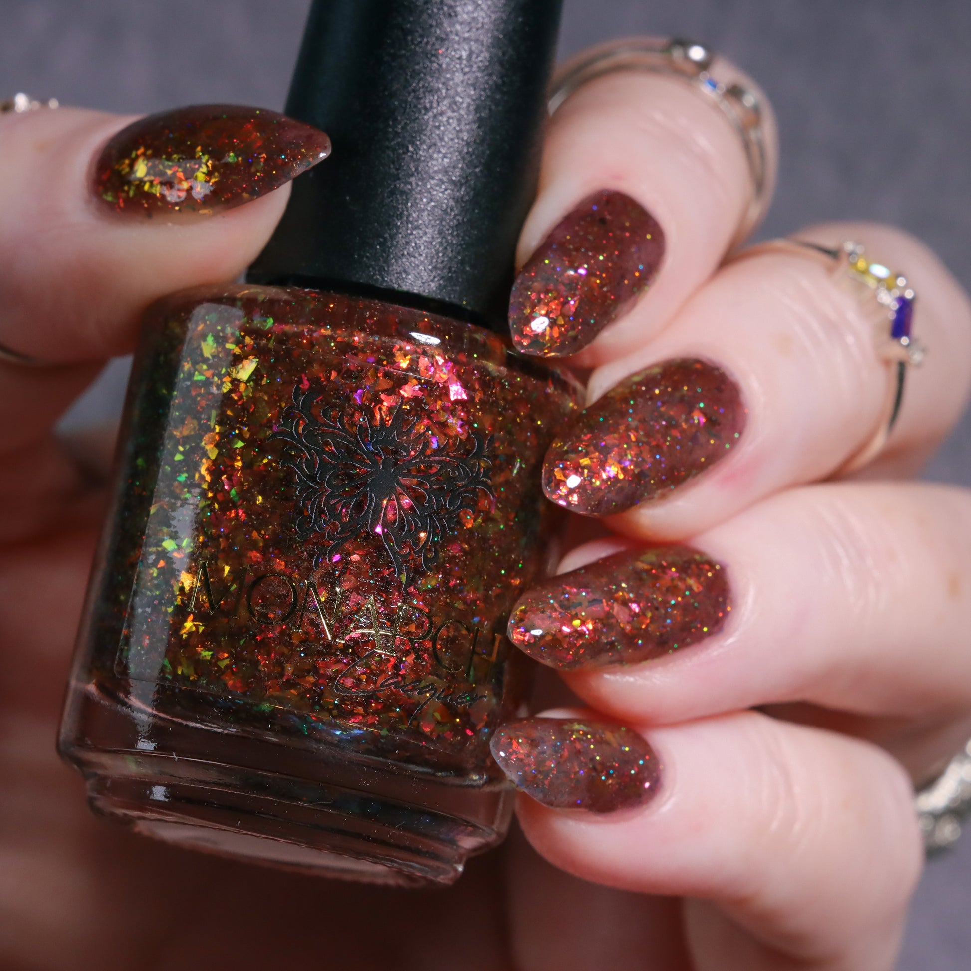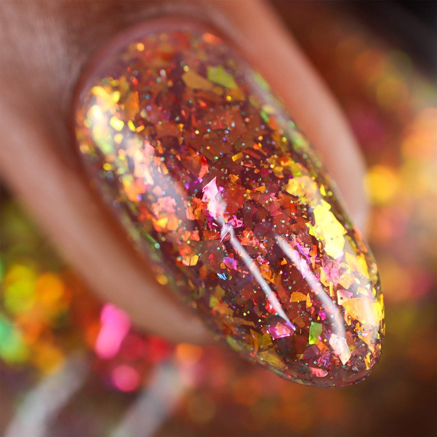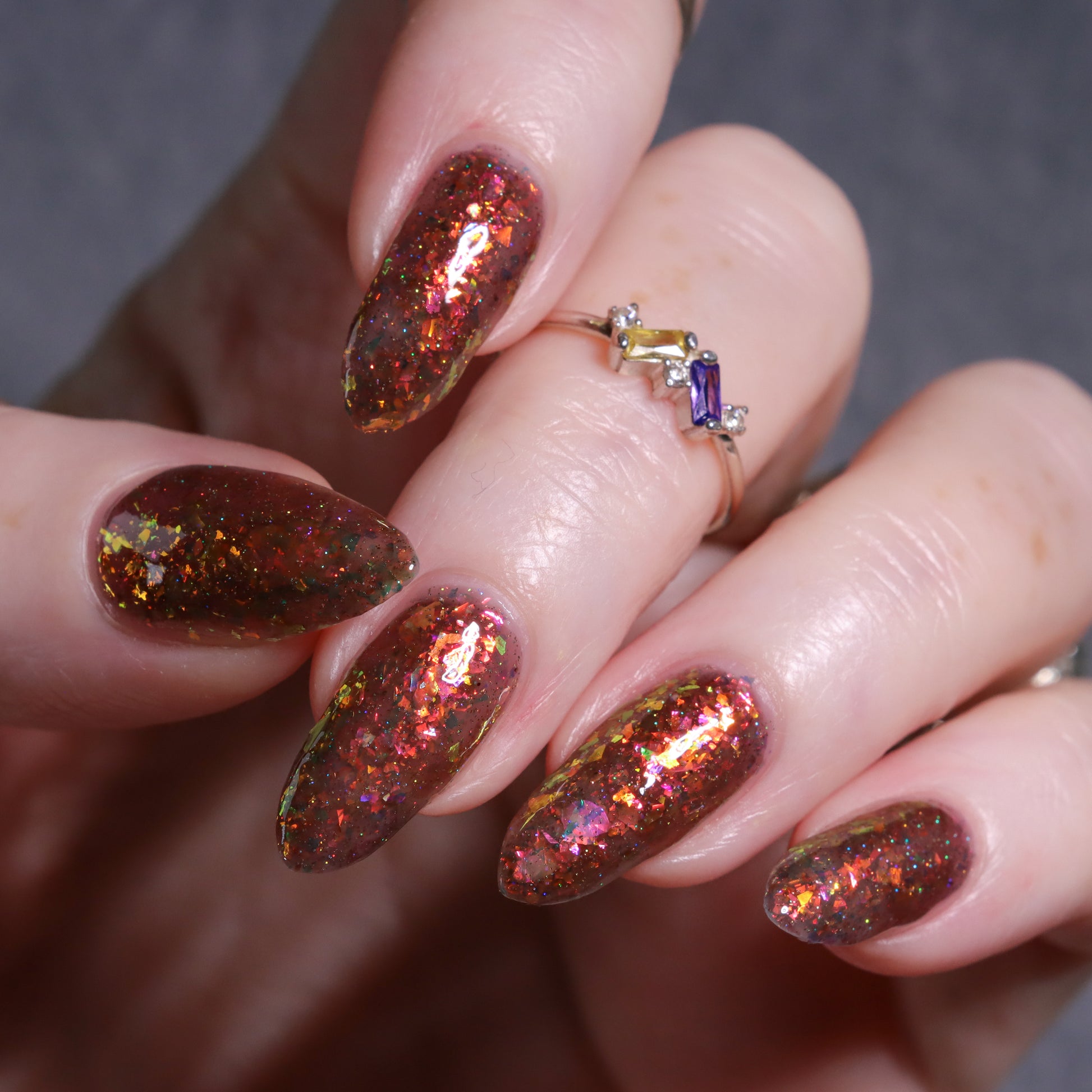 A taupe brown jelly base with red orange yellow green blue chameleon flake and hints of gold holo sparkle