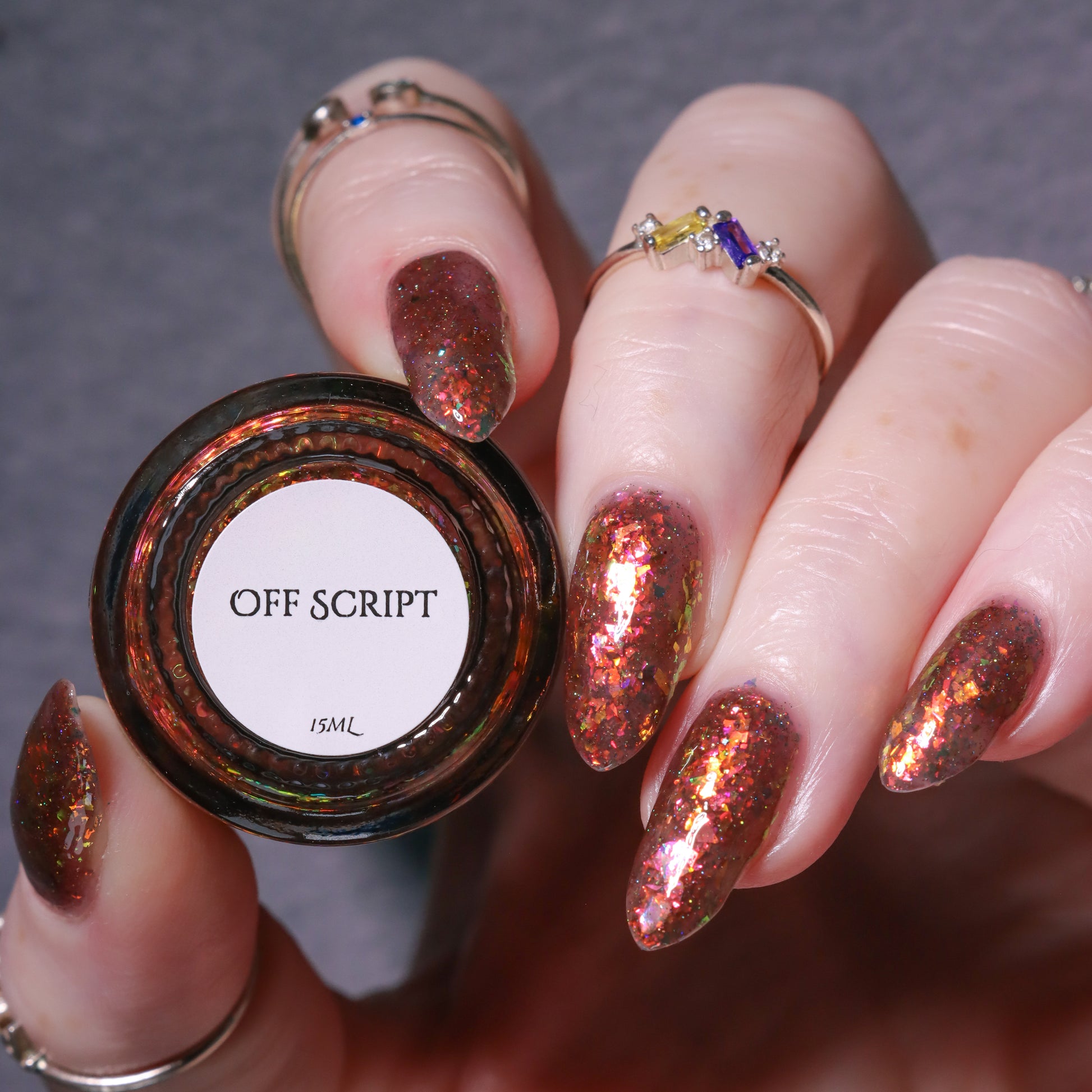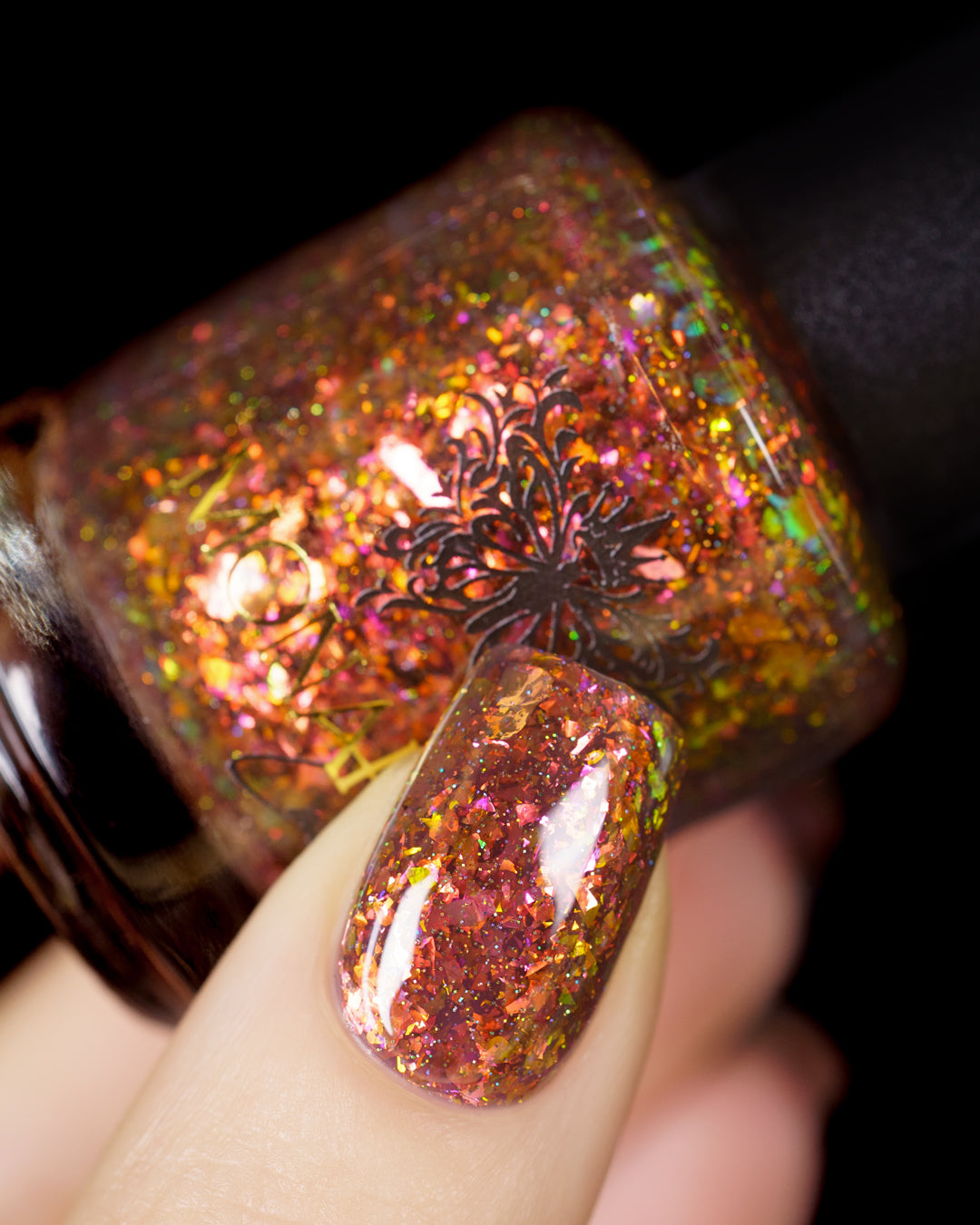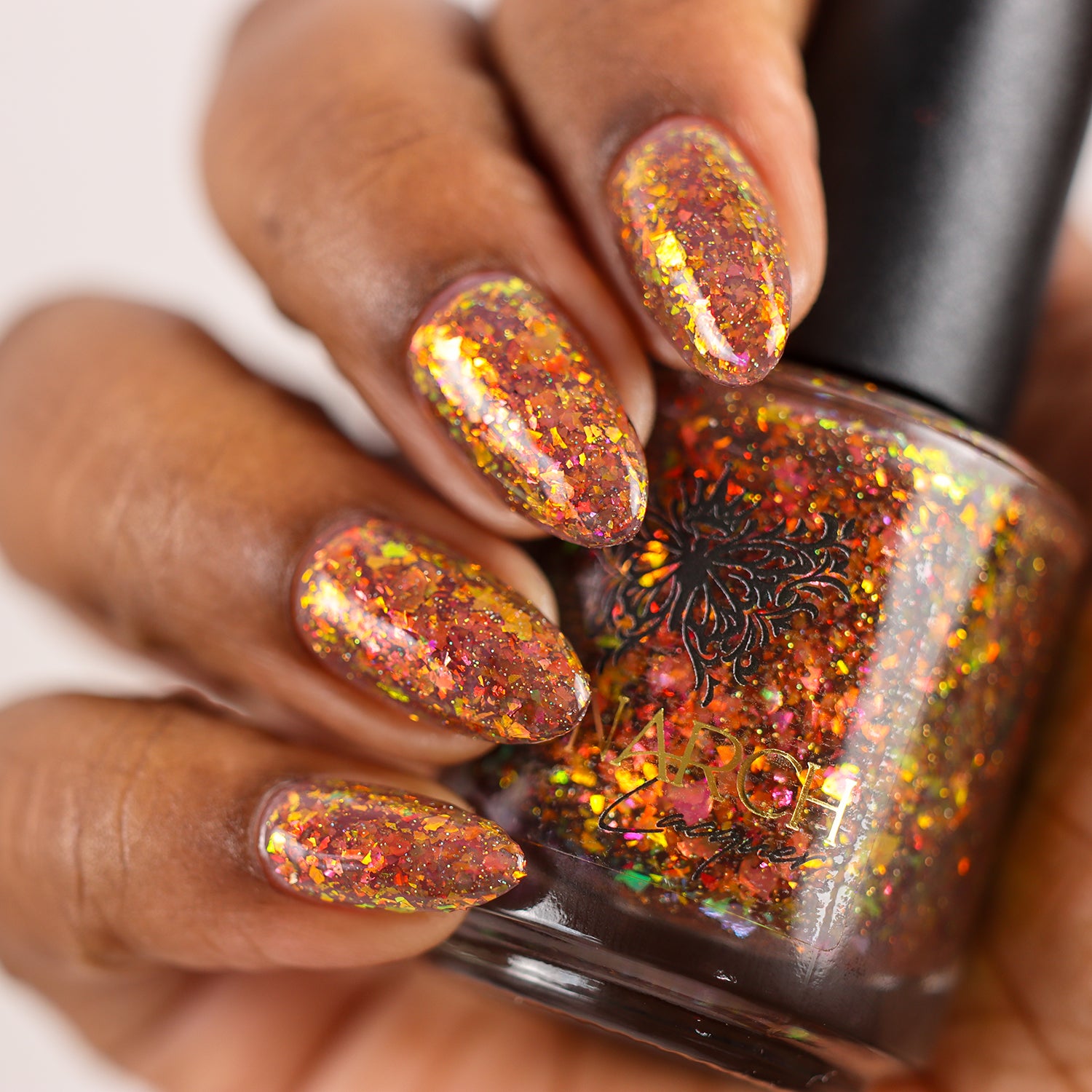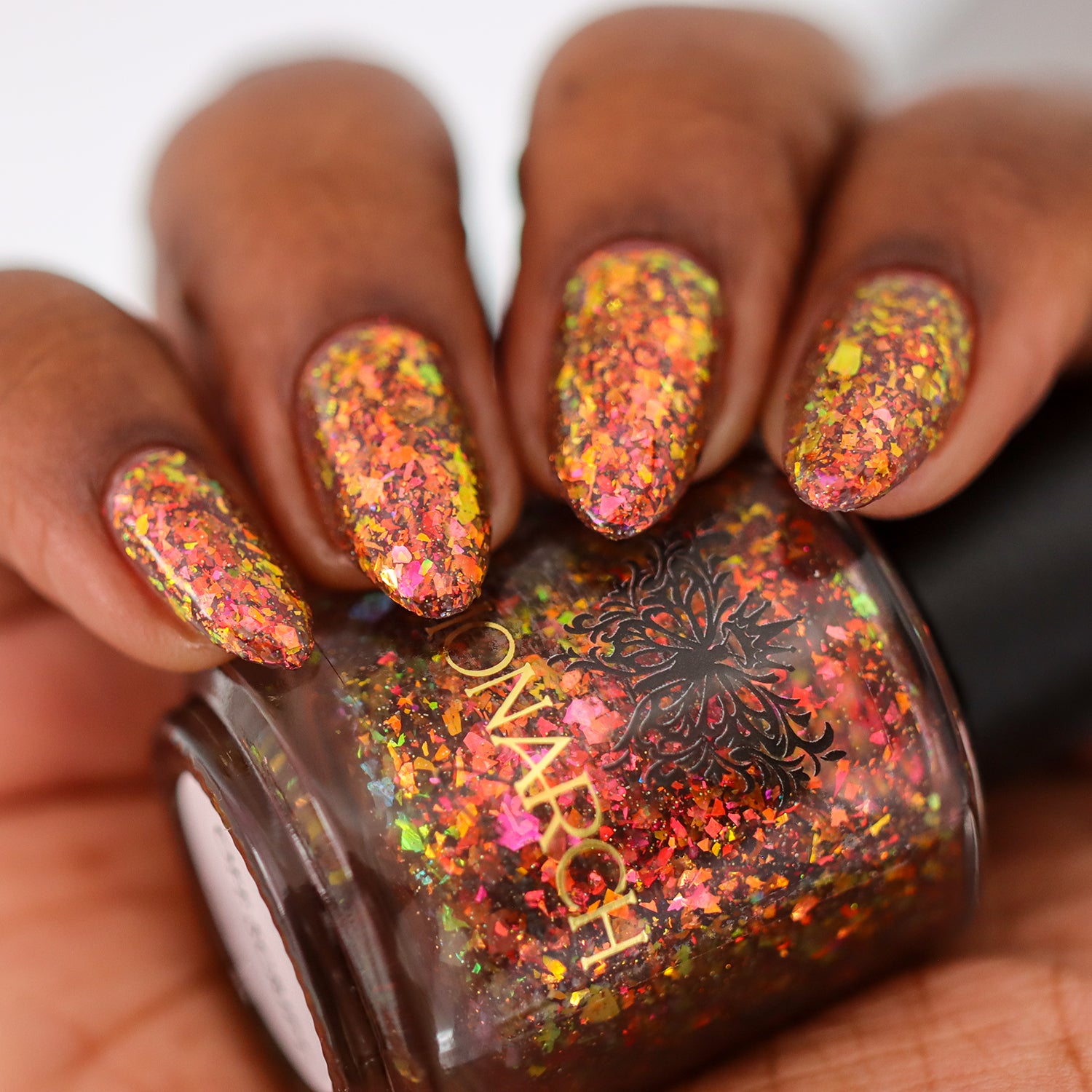 A taupe brown jelly base with red orange yellow green blue chameleon flake and hints of gold holo sparkle