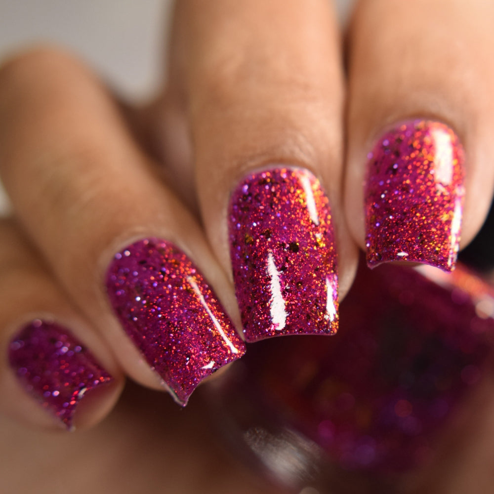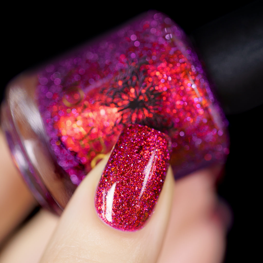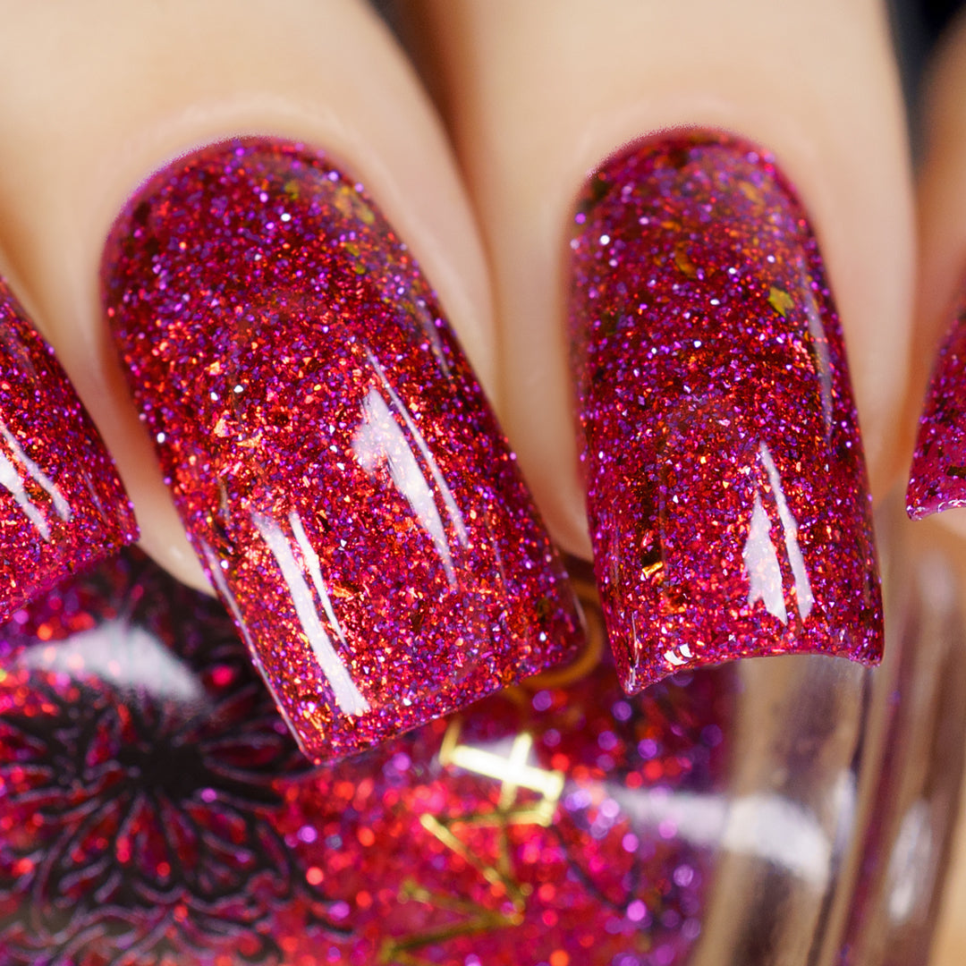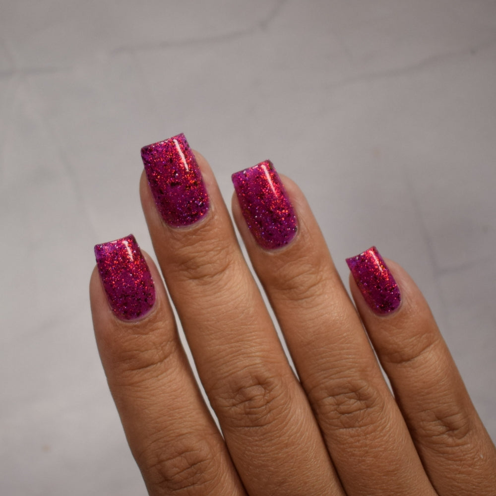 Get ready to turn heads with this cheeky berry-red jelly loaded with red-orange aurora sparkle that shifts with every move. Mix in some playful red-orange chroma flakes and reflective glitter, and you've got a nail look that's equal parts naughty and nice. Mischief never looked so good.