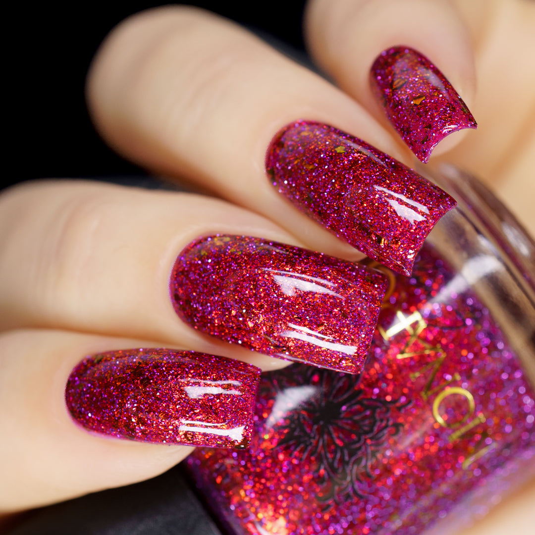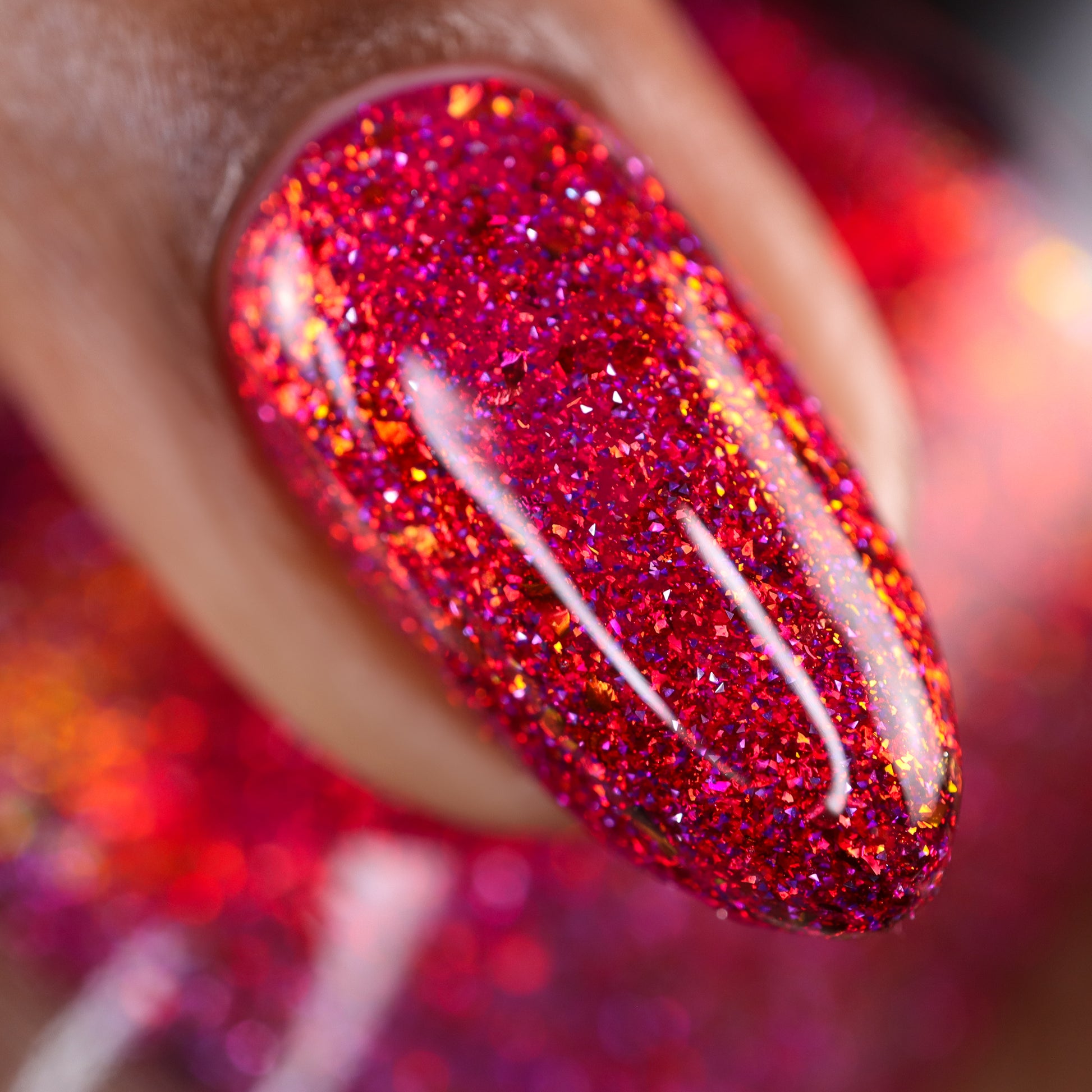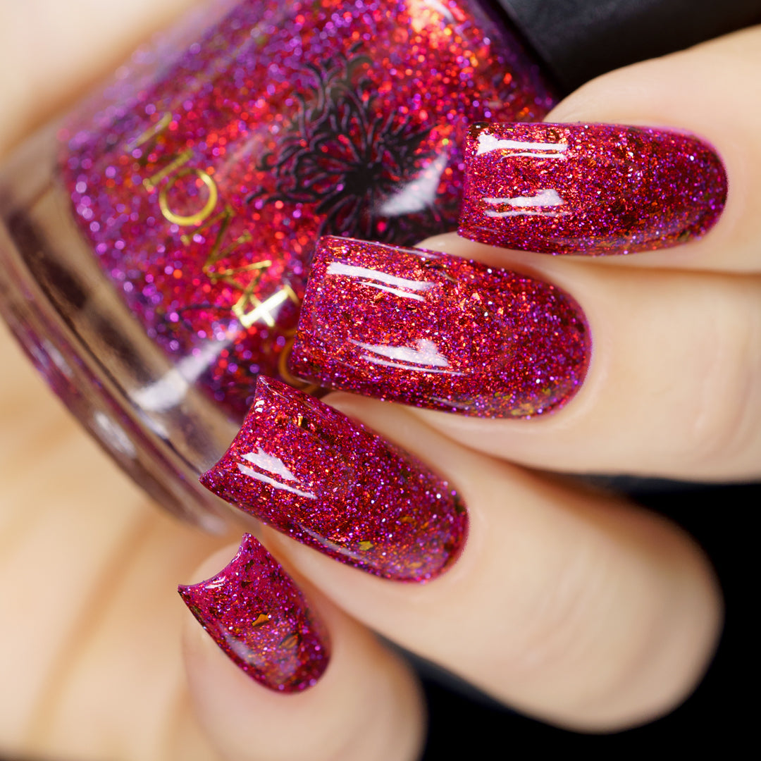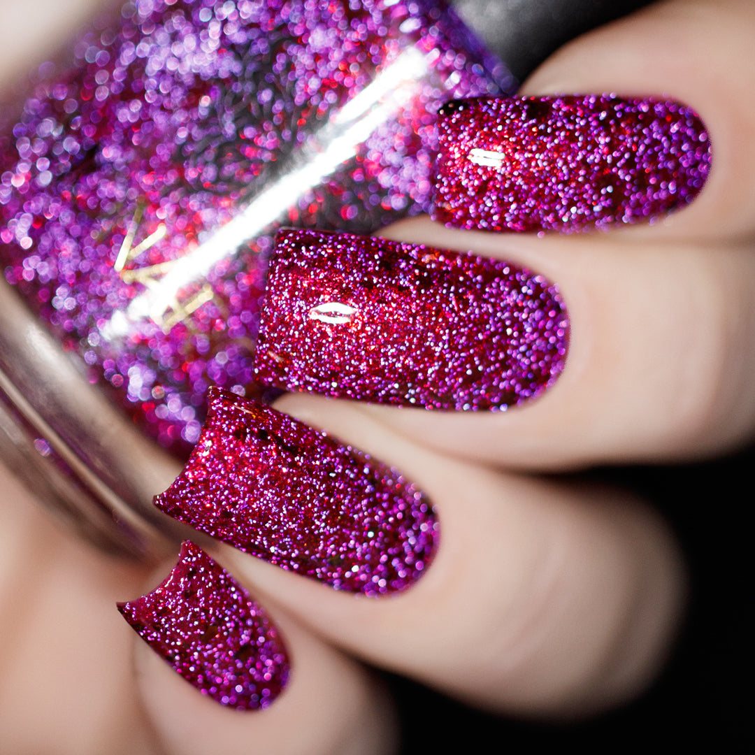 Get ready to turn heads with this cheeky berry-red jelly loaded with red-orange aurora sparkle that shifts with every move. Mix in some playful red-orange chroma flakes and reflective glitter, and you've got a nail look that's equal parts naughty and nice. Mischief never looked so good.