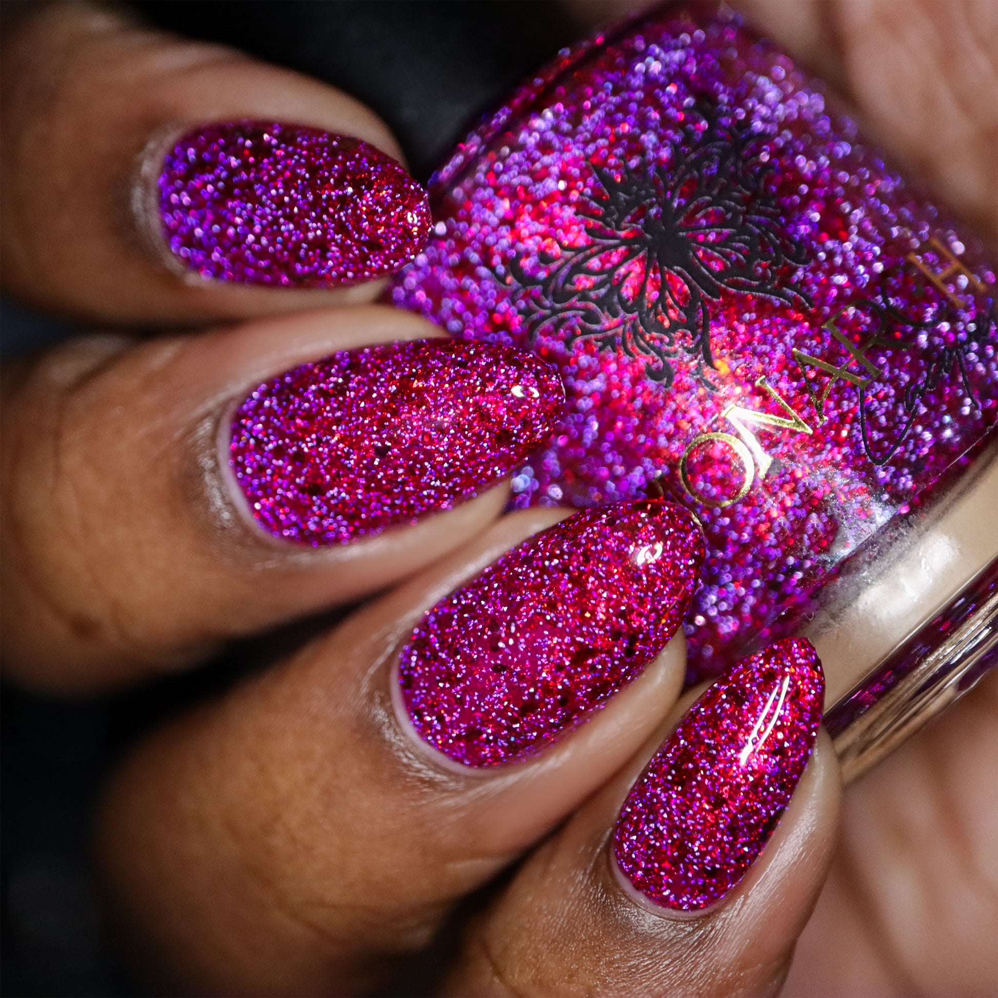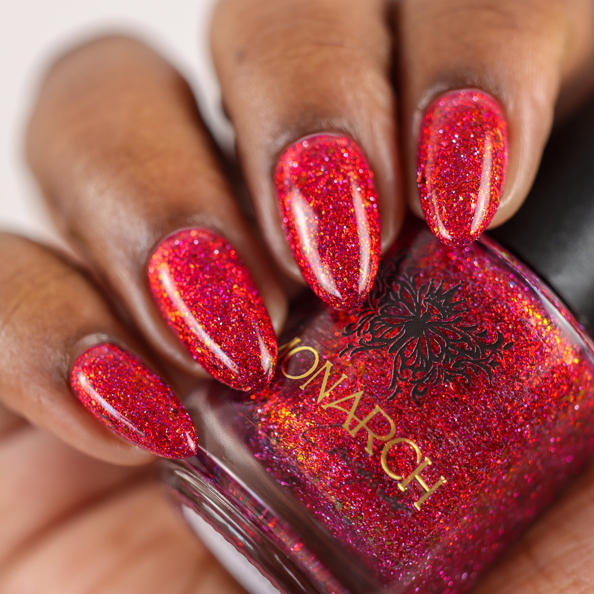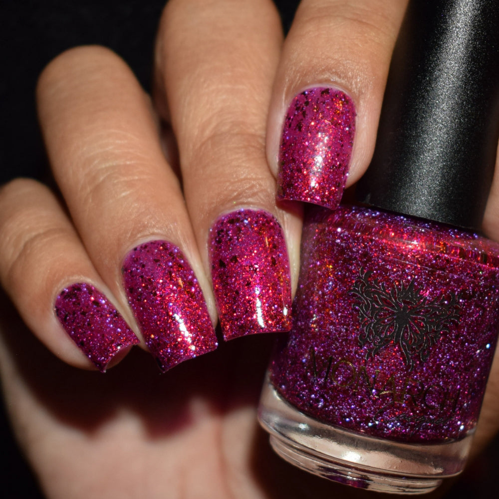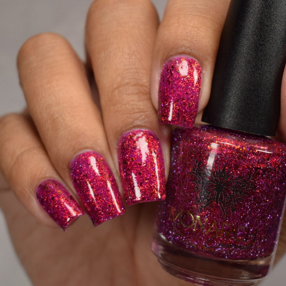 Get ready to turn heads with this cheeky berry-red jelly loaded with red-orange aurora sparkle that shifts with every move. Mix in some playful red-orange chroma flakes and reflective glitter, and you've got a nail look that's equal parts naughty and nice. Mischief never looked so good.