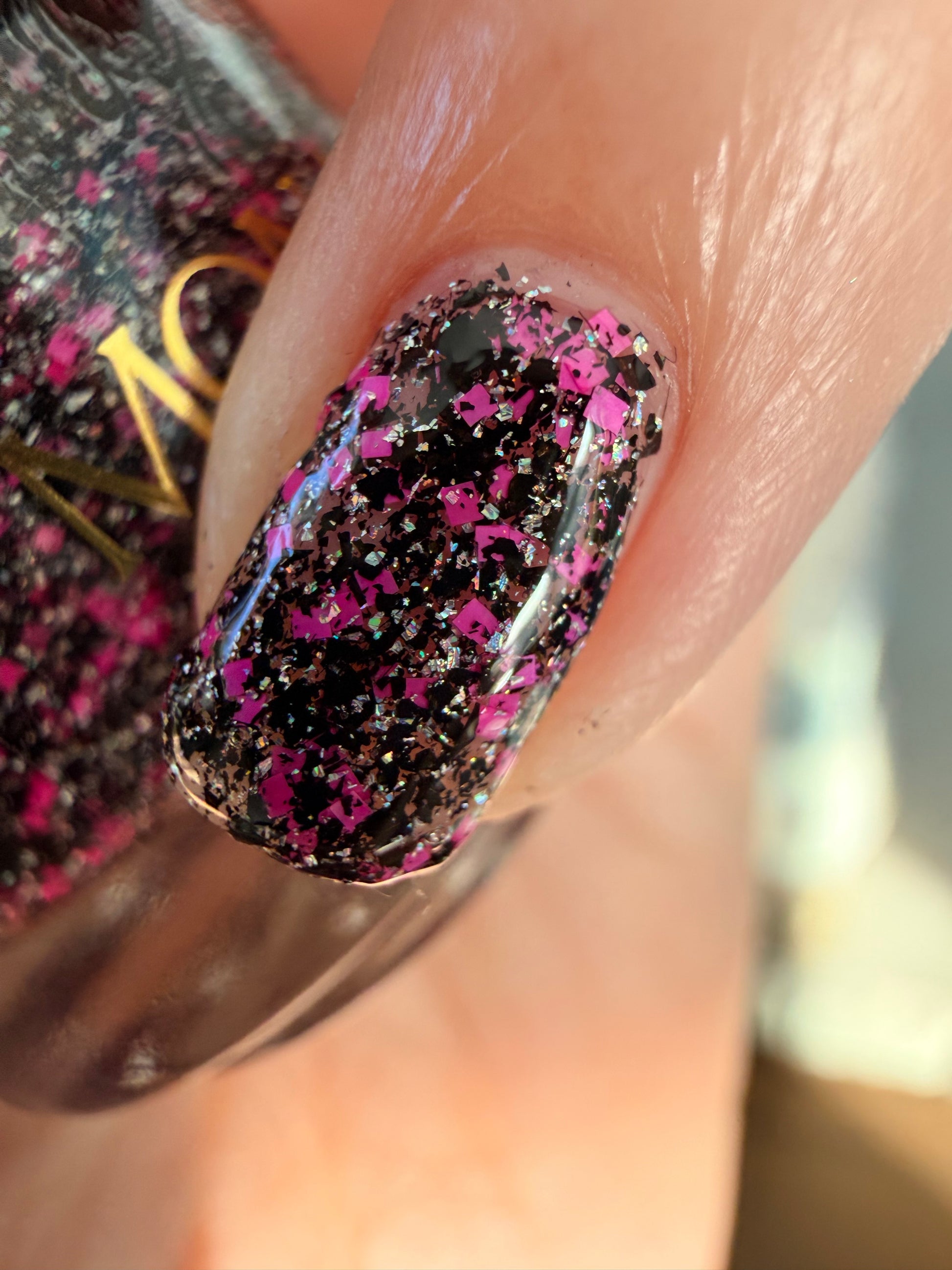 Mix it Monday, month one, week two! Panda at the Disco is a dense flakie glitter designed with black flake, neon pink glitter and holo flake. Opaque in 2-3 coats.