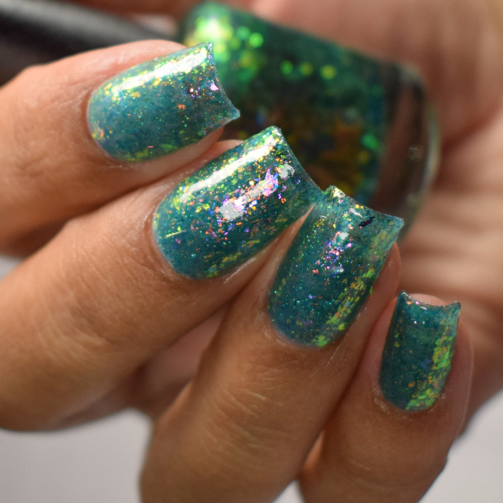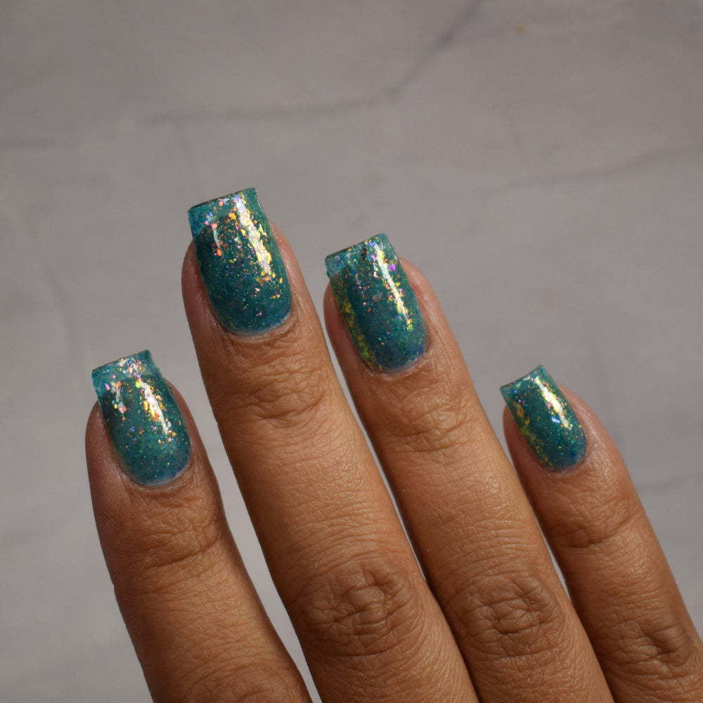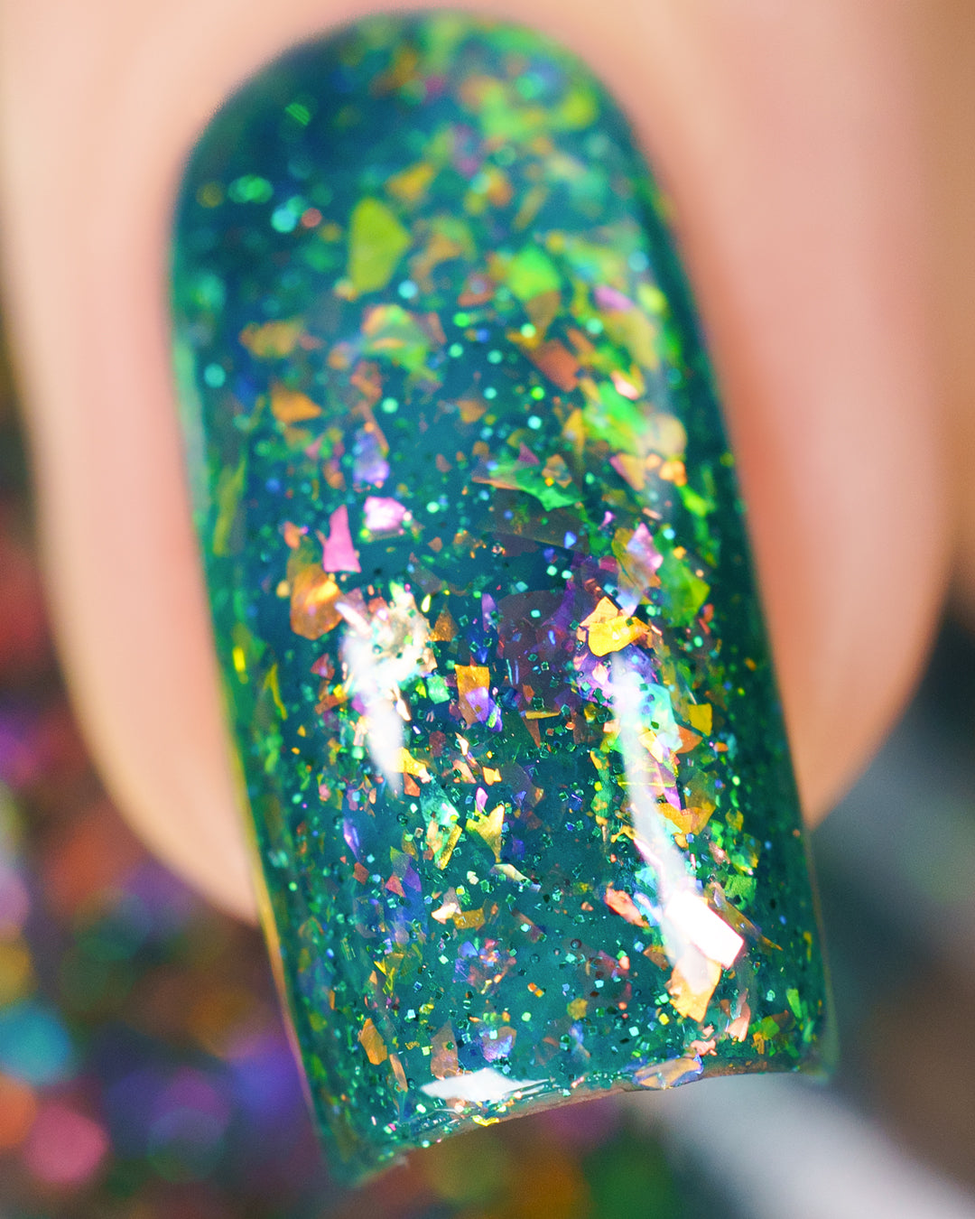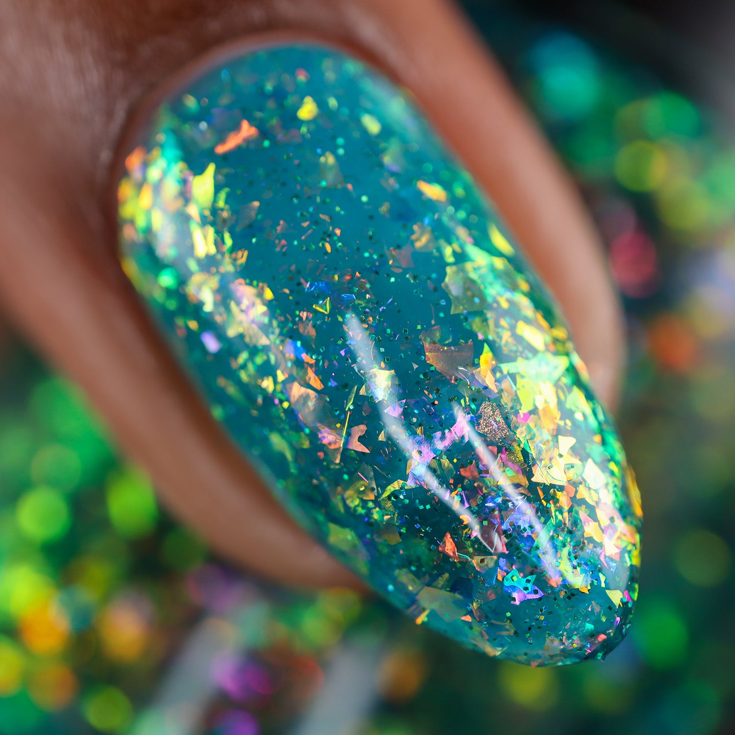 Moody teal jelly base with pink-orange-yellow-green chameleon flake and hints of gold holo sparkle