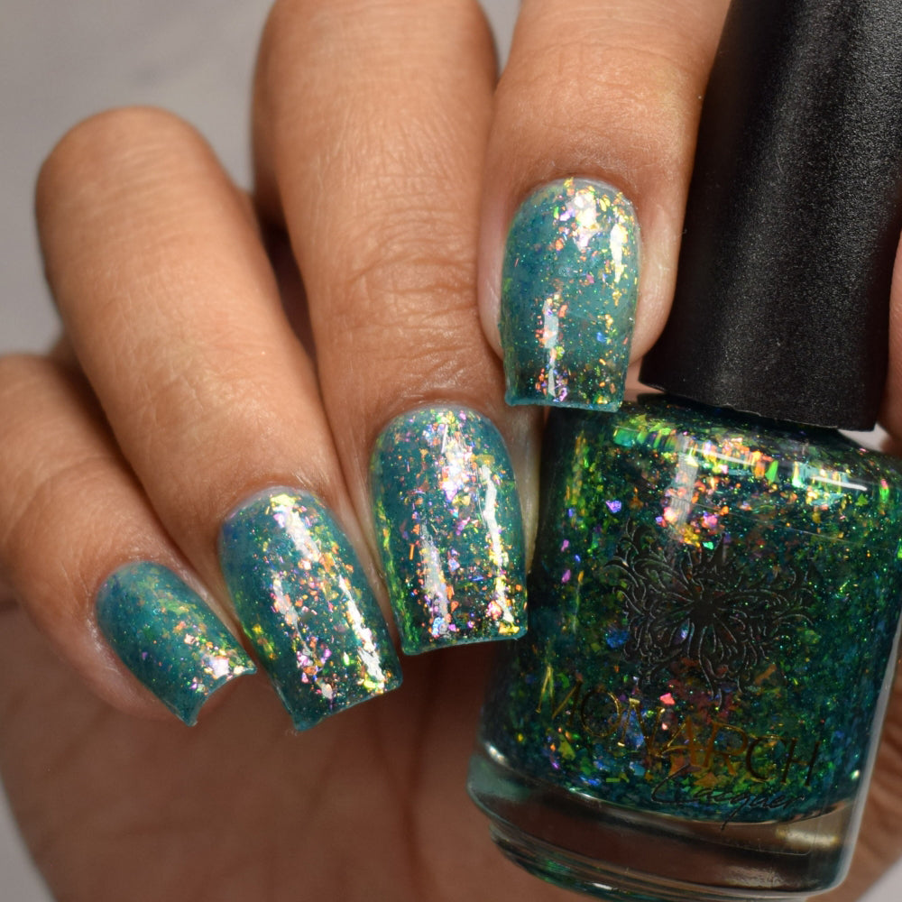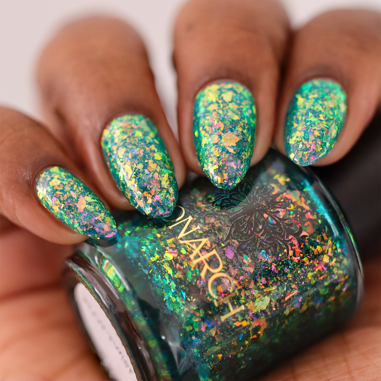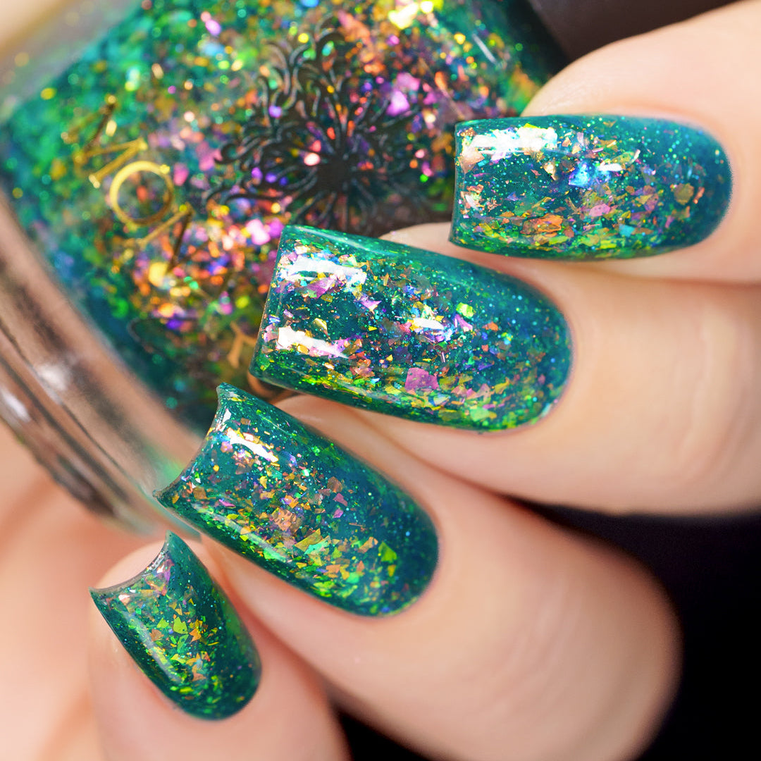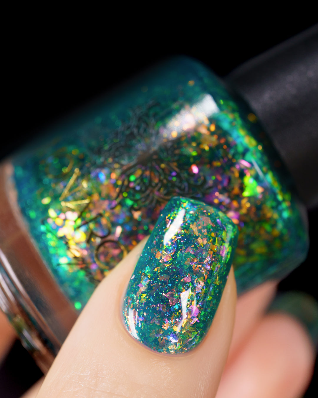 Moody teal jelly base with pink-orange-yellow-green chameleon flake and hints of gold holo sparkle