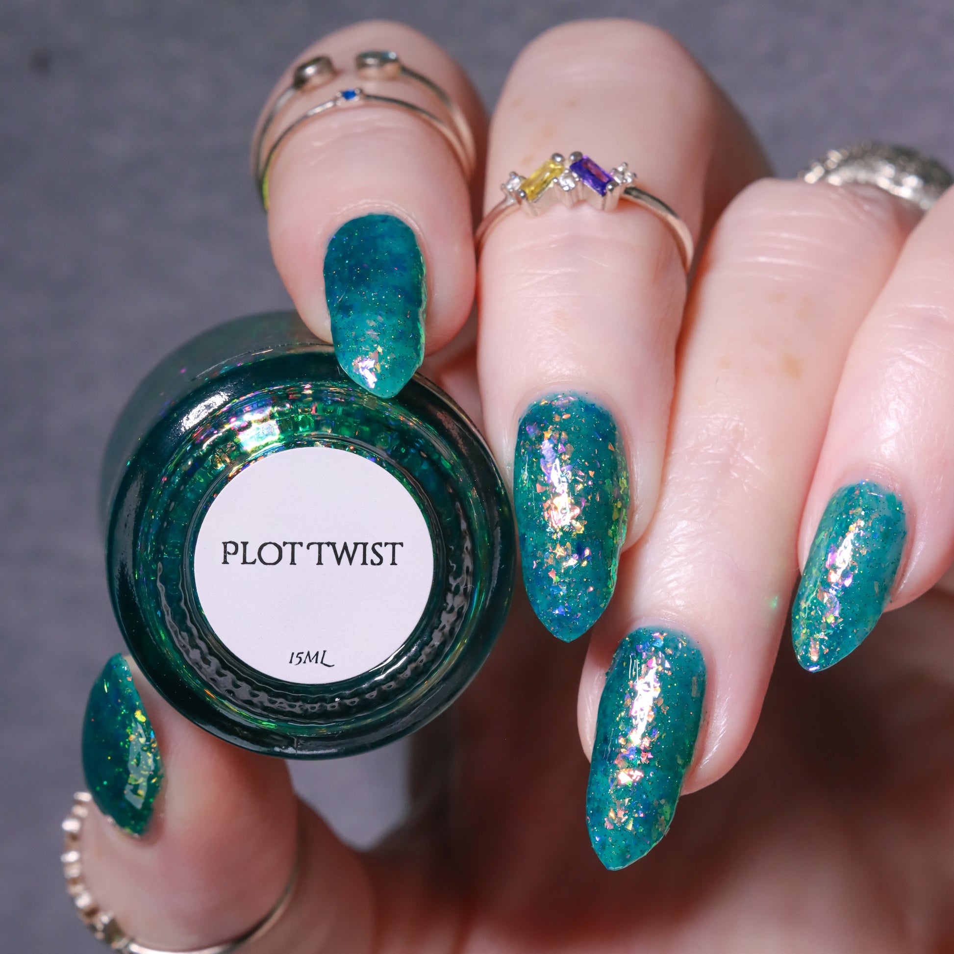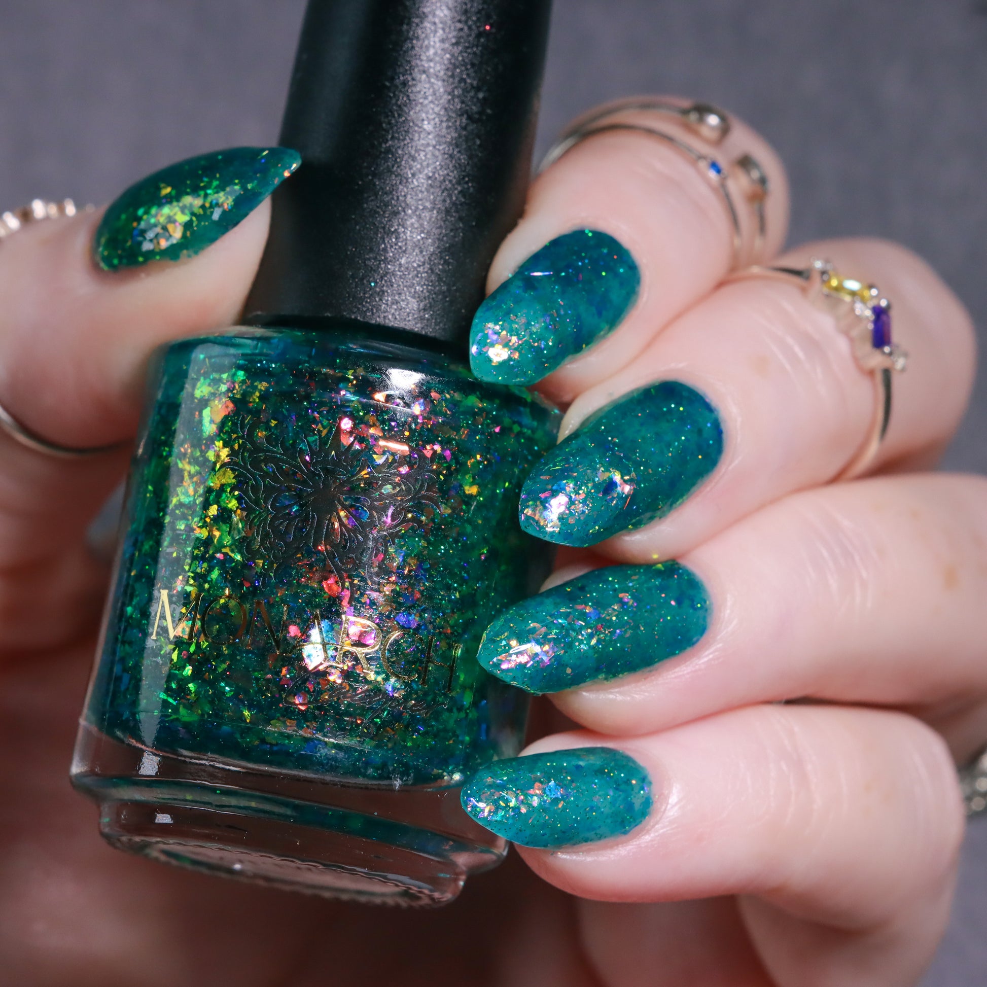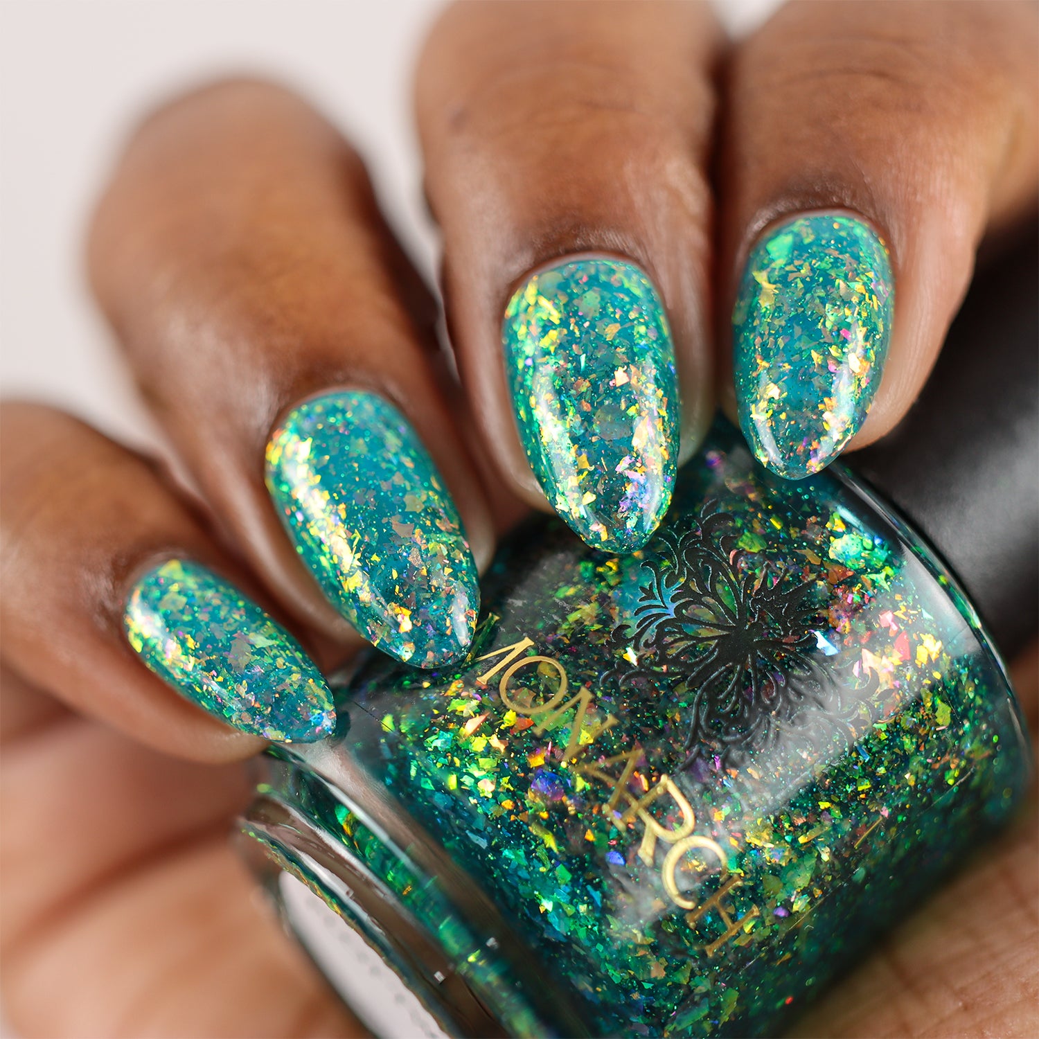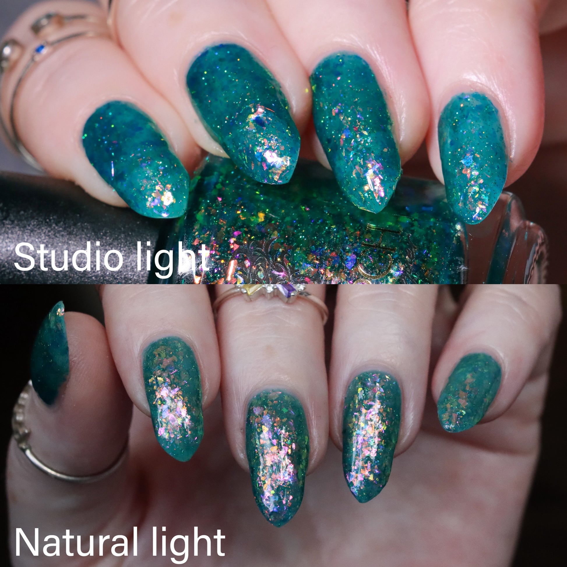 Moody teal jelly base with pink-orange-yellow-green chameleon flake and hints of gold holo sparkle