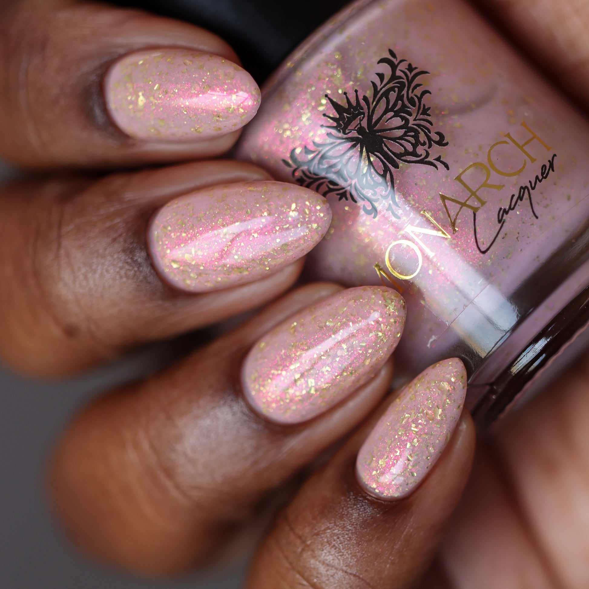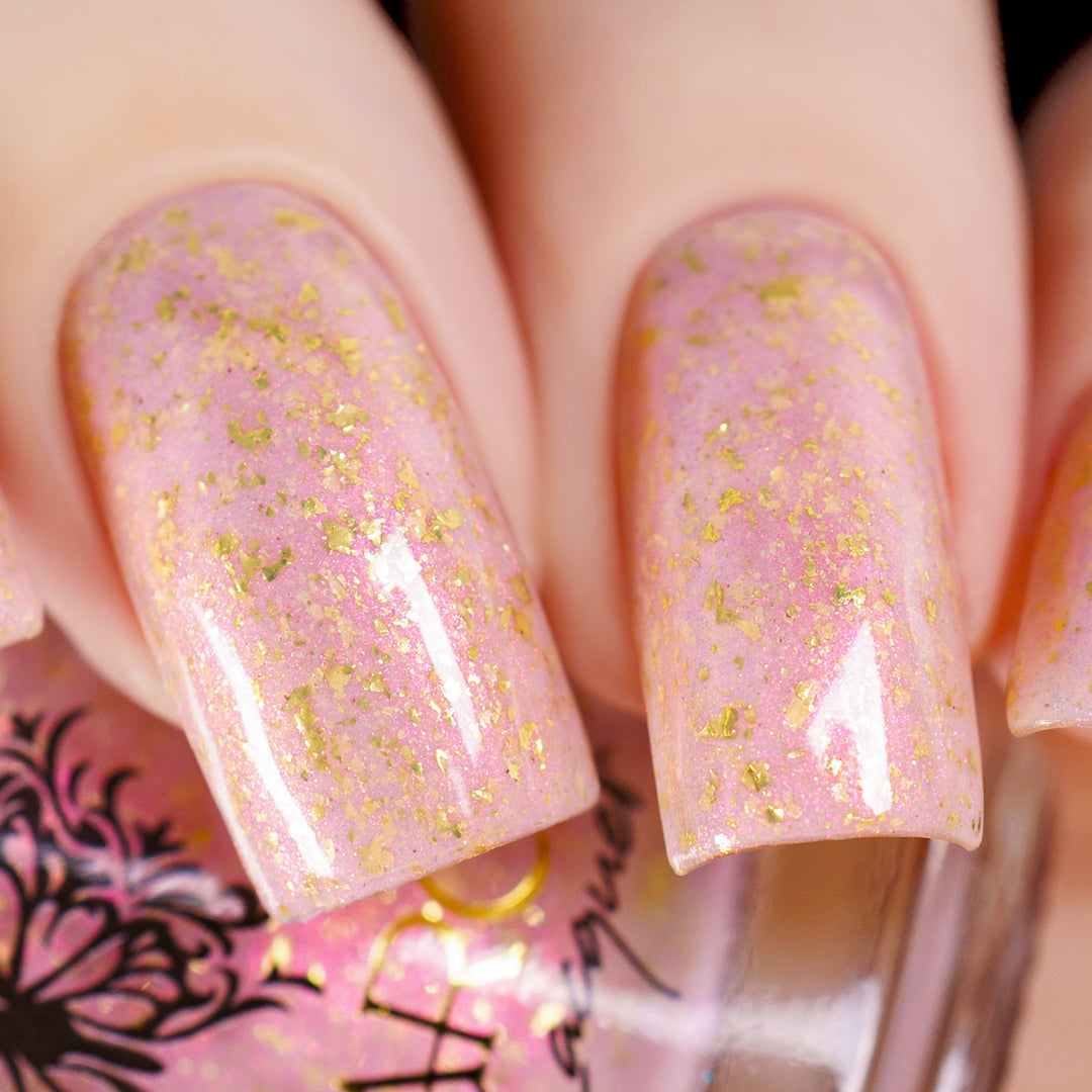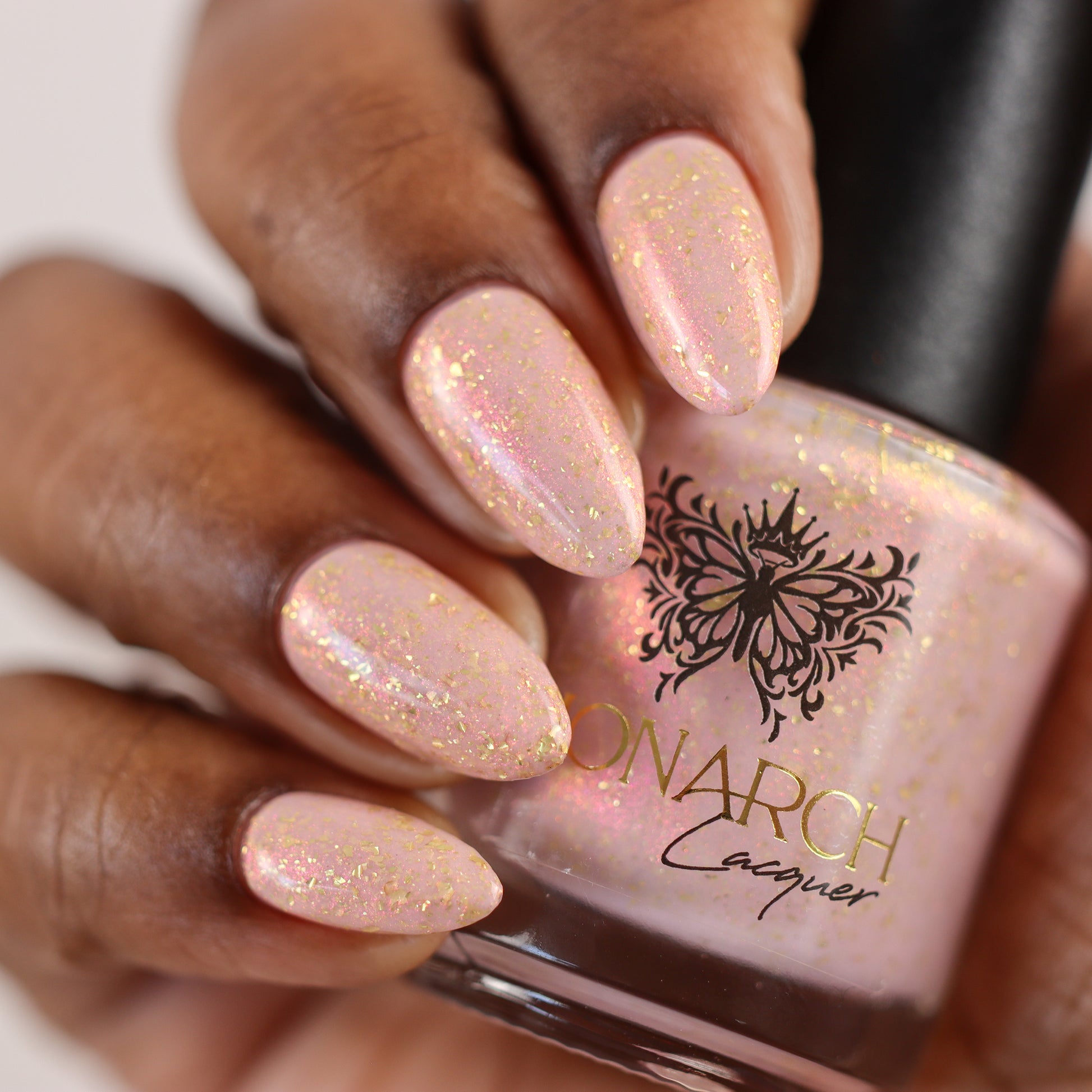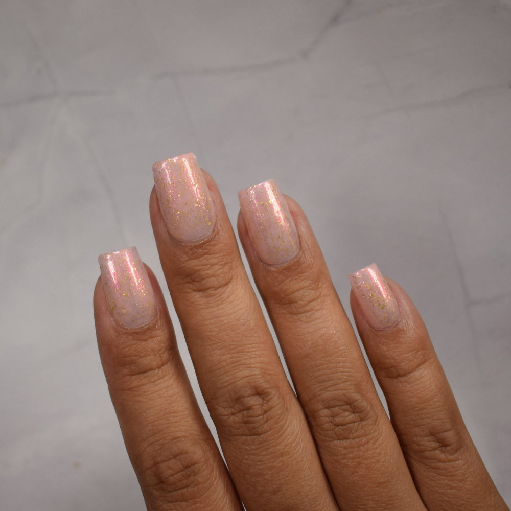 A delicate baby pink that floats on the nail like holiday magic, sprinkled with glimmering gold flecks for just the right amount of festive sparkle.