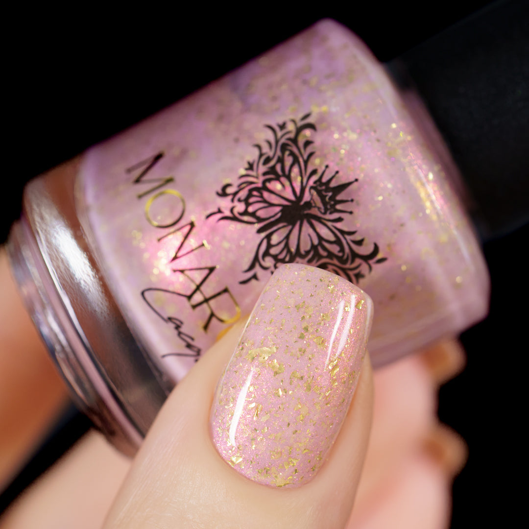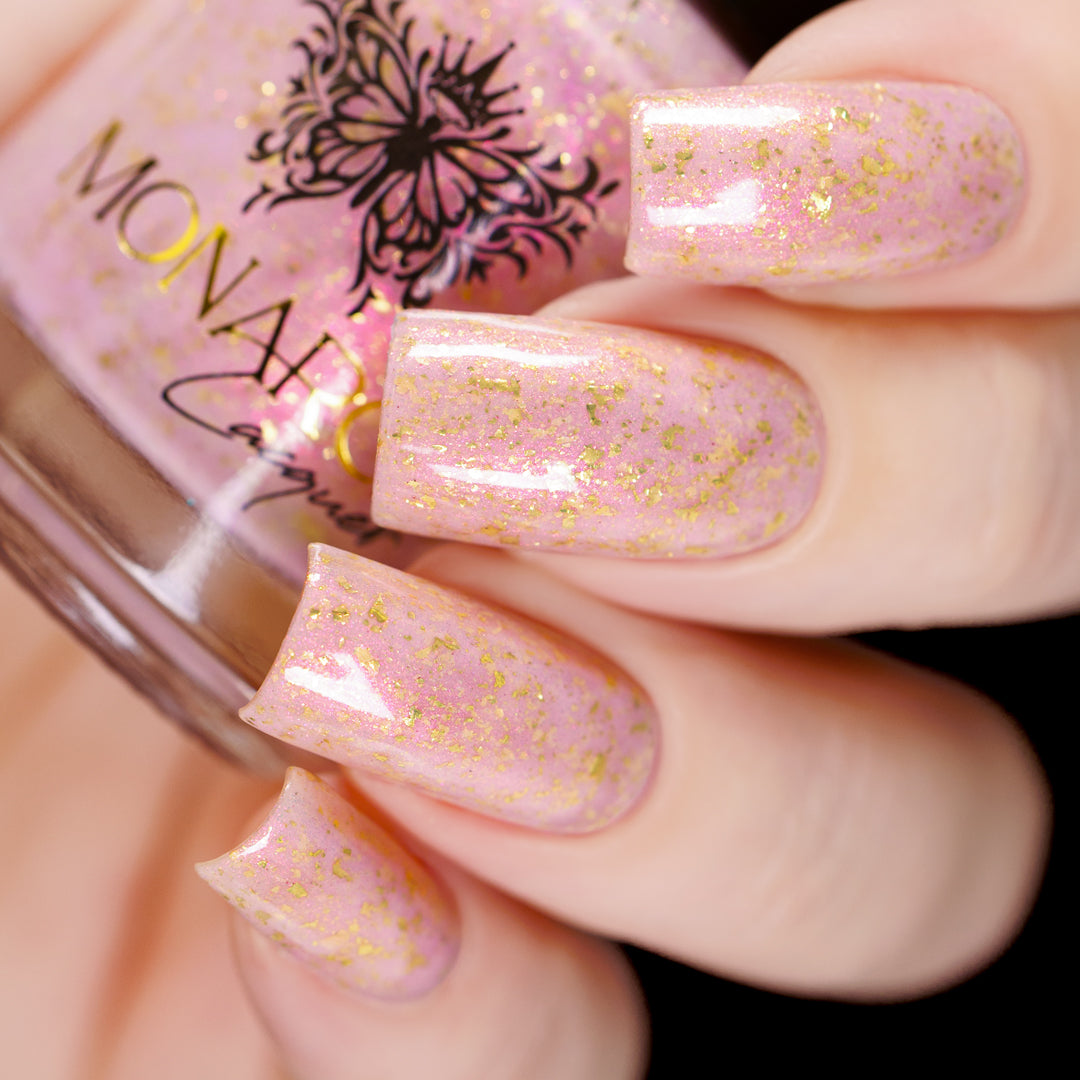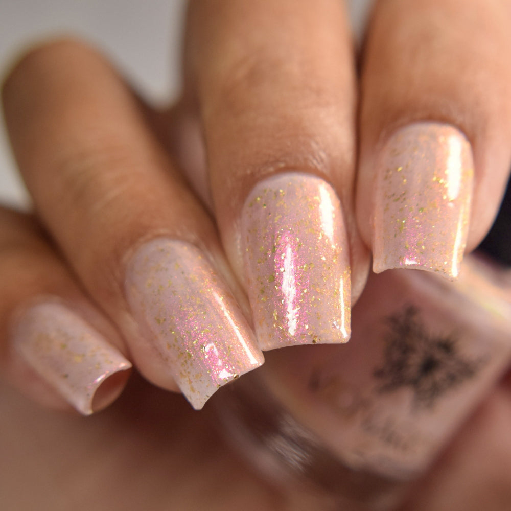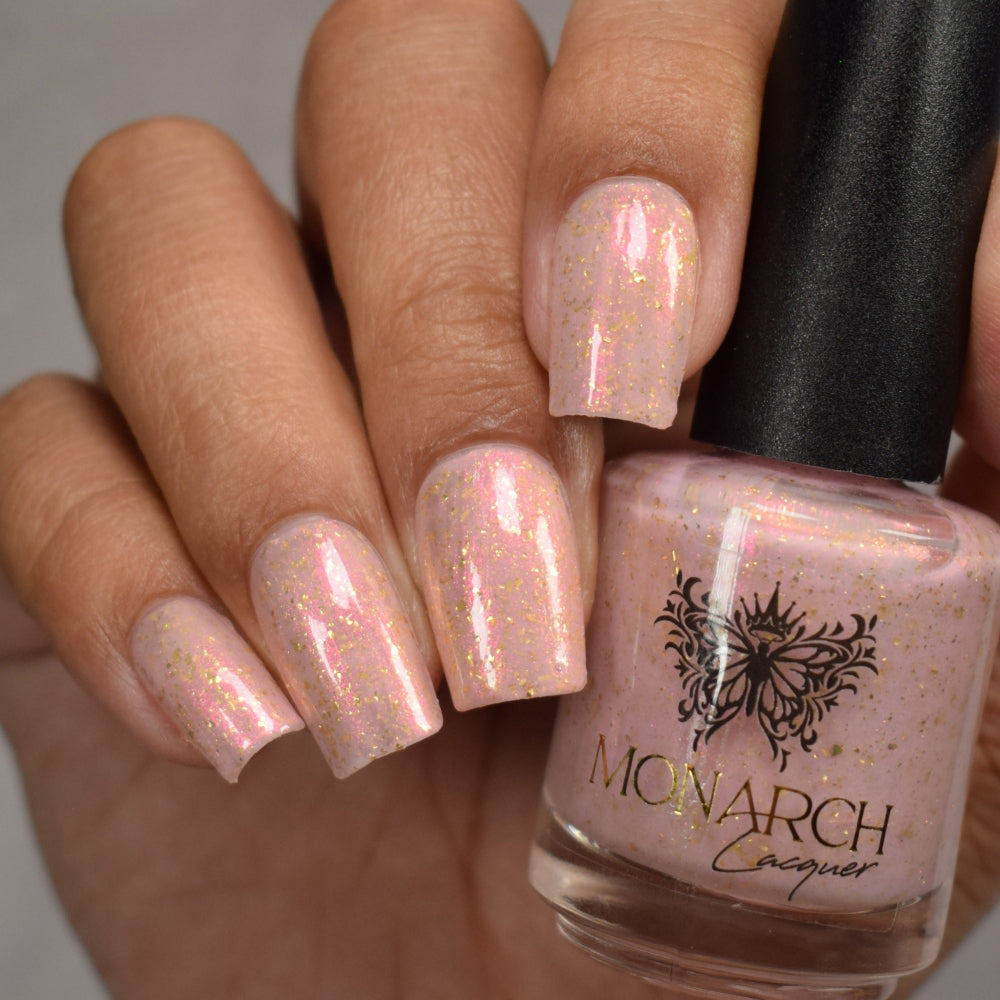 A delicate baby pink that floats on the nail like holiday magic, sprinkled with glimmering gold flecks for just the right amount of festive sparkle.