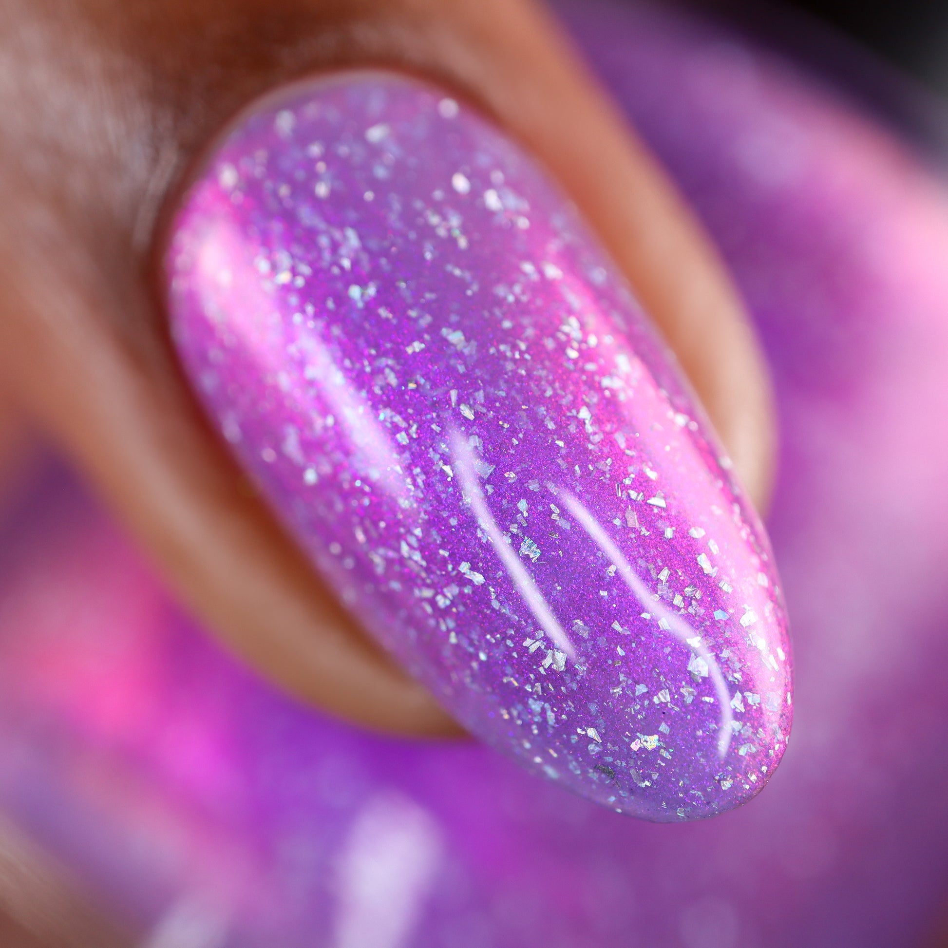 A cool-toned purple beauty that bursts with fiery orange-pink-red shimmer and sparkles with silvery holographic flakes.